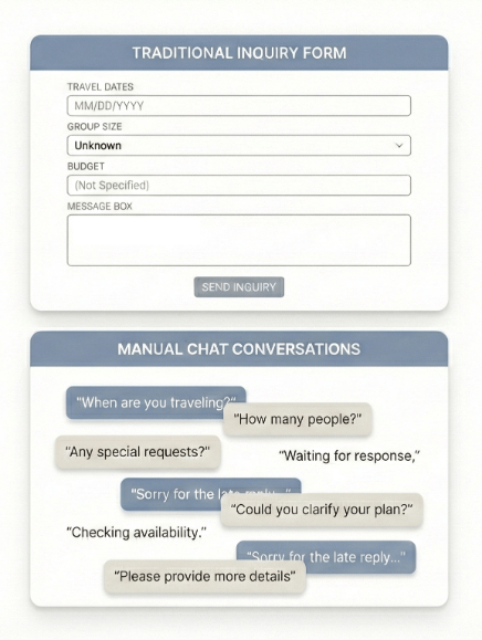 Traditional Inquiry Handling is dead. Get high-quality inquiries 24/7 with an AI assistant that chats naturally, qualifies intent, and recommends your signature tours.